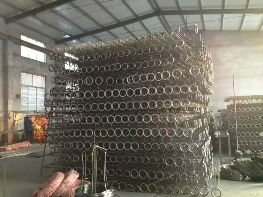 A除塵器骨架,袋籠制作要求支撐環(huán)和縱筋分布均勻,并應(yīng)有足夠的強(qiáng)度和鋼度,金澄公司骨架所用線材為國內(nèi)_碳素鋼Q235,有直徑5-6mm線材鋼經(jīng)_設(shè)備-拉直機(jī)拉制到所需直徑,使其達(dá)到_強(qiáng)度及挺直的要求,能承受濾袋在過濾及清灰狀態(tài)中的氣體壓力,能防止在正常運輸和安裝過程中發(fā)生的碰撞和沖擊所造成的損壞和變形;