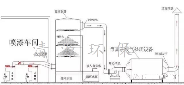 清源環(huán)保公司噴涂噴漆廢氣處理設備,噴漆房廢氣治理,噴涂廢氣治理采用噴淋塔和光氧催化及低溫等離子綜合處理系統(tǒng)。