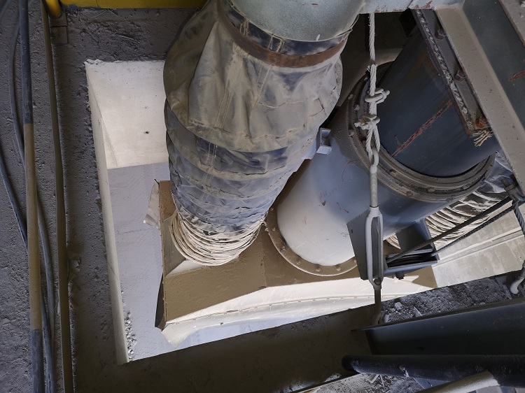 平臺(tái)下方結(jié)構(gòu):耐溫85°耐磨伸縮外布袋Φ600和內(nèi)布袋內(nèi)Φ300、散裝頭總成。鋼制散裝頭呈倒錐外型,其外側(cè)包有厚橡膠皮,可起到與灰罐車(chē)裝灰圓口的密封作用。