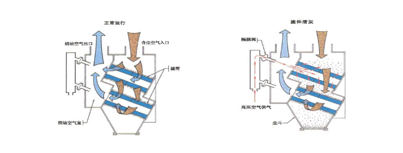 含塵氣體在風機的引導(dǎo)下進入除塵器后,由于氣流端面的突然擴大及氣流分布板的作用,氣流中一部分顆粒粗大的塵粒在重力和慣性力的作用下,沉降到灰斗;粒度細、密度小的塵粒進入過濾室,通過布朗擴散和纖維攔截等綜合效應(yīng),使粉塵沉積在濾筒的濾料表面,凈化后的氣體進入凈氣室內(nèi),由出風口經(jīng)風機排出。
