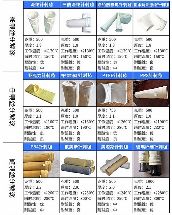 除塵布袋的材質(zhì)是按照使用工況的溫度來進(jìn)行分類,有高溫布袋、中溫布袋及常溫布袋;高溫布袋材質(zhì)有P84針刺氈、氟美斯、美塔斯、玻纖針刺氈等;中溫布袋材質(zhì)有PPS針刺氈、PTFE針刺氈、芳斯特針刺氈、亞克力針刺氈等;常溫布袋材質(zhì)有滌綸針刺氈、覆膜滌綸針刺氈、拒水防油針刺氈、拒水防油芳靜電針刺氈等;根據(jù)使用工況選用各種材質(zhì)濾料。