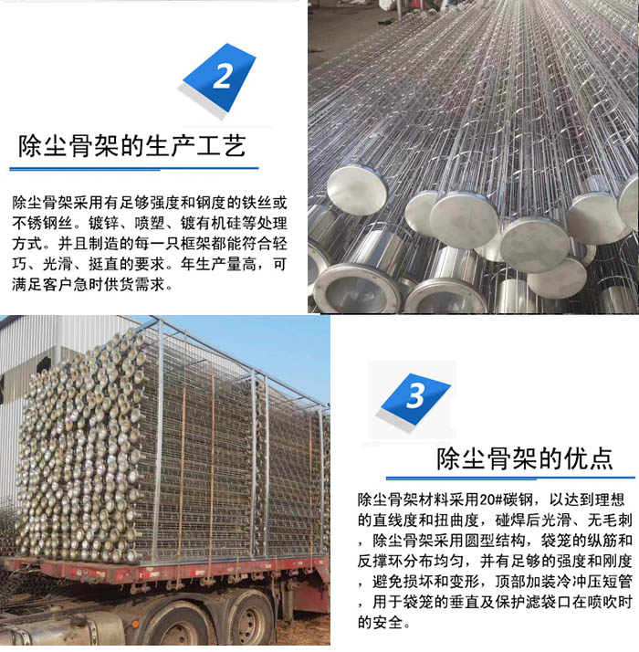 除塵骨架要求支撐環(huán)和縱筋分布均勻,并應(yīng)有足夠的強(qiáng)度和剛度,能承受濾袋在過(guò)濾及清灰狀態(tài)中的氣體壓力,能防止在正常運(yùn)輸和安裝過(guò)程中發(fā)生的碰撞和沖擊所造成的損壞和變形.