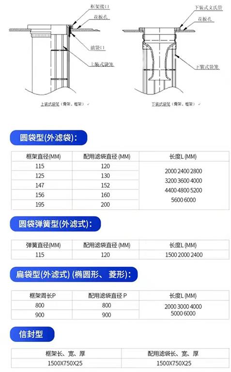 1. 圓袋型(外濾袋) 2. 圓袋彈簧型(外濾式) 3. 扁袋型(外濾式)(橢圓形、菱形) 4. 信封型 5. 多節(jié)式框架(橢圓型多節(jié)框架. 圓袋型多節(jié)框架(插節(jié)式、卡盤(pán)式)) 6. 成品框架(帶文氏管的框架. 塑料袋、鐵架包裝的框架. 排列整齊的菱形框架)