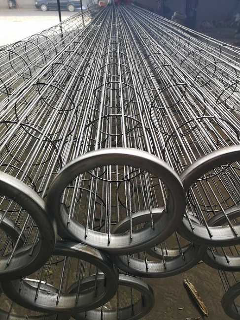 .袋籠籠骨采用20號鋼冷拔絲制作,直徑≥φ4mm,上端口須有防止脈沖氣流(壓縮空氣)直接沖刷濾袋口的有效保護(hù)結(jié)構(gòu)(保護(hù)套長度不小于300mm);袋籠應(yīng)堅(jiān)固,袋籠的縱筋和反撐環(huán)繞筋線分布均勻,豎筋數(shù)量不小于16根,豎筋之間間距不大于30mm,反撐環(huán)繞筋線間隔不大于250mm,垂直度滿足規(guī)范要求。