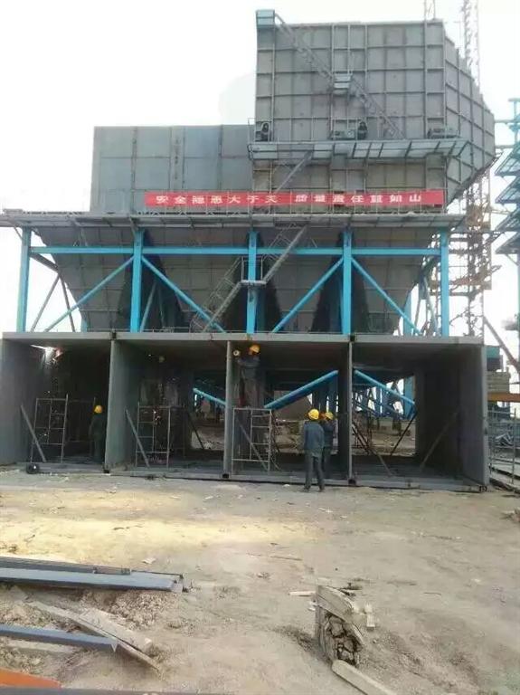 鍋爐布袋除塵器的氣體凈化方式為外濾式,含塵氣體由導(dǎo)流管進(jìn)入各單元過(guò)濾室并通過(guò)進(jìn)風(fēng)閥進(jìn)入設(shè)置于除塵器灰斗上側(cè)的煙氣導(dǎo)流裝置;氣流通過(guò)阻流加導(dǎo)流型氣流分布裝置的適當(dāng)導(dǎo)流和自然流向分布,從下部均勻進(jìn)入袋室,整個(gè)過(guò)濾室內(nèi)氣流分布均勻;含塵氣體中的顆粒粉塵在進(jìn)風(fēng)道內(nèi)通過(guò)自然沉降分離后直接落入灰斗,其余粉塵在煙氣導(dǎo)流裝置的引導(dǎo)下,隨氣流進(jìn)入中箱體過(guò)濾區(qū),吸附在濾袋外表面。鍋爐布袋除塵器過(guò)濾后的潔凈氣體透過(guò)濾袋經(jīng)上箱、排風(fēng)管排出。因采用下部進(jìn)風(fēng)的方式,濾袋底部與進(jìn)風(fēng)口留有相當(dāng)?shù)母叨龋业臍饬魃仙俣群艿?,基本杜絕了二次揚(yáng)塵的產(chǎn)生。
