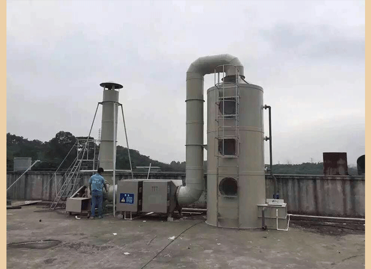 集風(fēng)罩--降溫塔--噴淋塔--UV光解箱--玻璃鋼風(fēng)機(jī)--排放