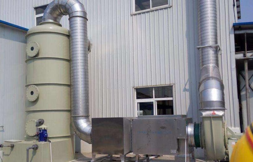 將以上三種處理方法結合在一起,處理效果將大大提高。首先廢氣進入水噴淋,在噴淋室中以1.8m/s左右的緩慢速度通過。噴淋室內(nèi)噴淋液經(jīng)過霧化器的霧化形成層層水膜,首先廢氣由噴淋塔進氣口流入空氣室,然后經(jīng)過_層填料進行水洗,去除廢氣中的40%-60%的漆霧顆粒以及溶解部分溶于水的廢氣,然后進入_層填料進行水洗,_去除廢氣中全部的漆霧顆粒和溶解部分溶于水的廢氣(防止漆霧粘結燈管,影響光氧設備凈化效率和后續(xù)設備的維護成本)。然后經(jīng)水噴淋上端的除霧器進行水份吸收。接著廢氣進入光氧催化設備或等離子設備。