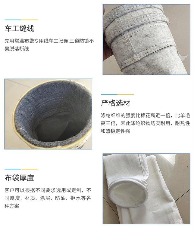 除塵布袋的材質(zhì)是按照使用工況的溫度來進(jìn)行分類,有高溫布袋、中溫布袋及常溫布袋;高溫布袋材質(zhì)有P84針刺氈、氟美斯、美塔斯、玻纖針刺氈等;中溫布袋材質(zhì)有PPS針刺氈、PTFE針刺氈、芳斯特針刺氈、亞克力針刺氈等;常溫布袋材質(zhì)有滌綸針刺氈、覆膜滌綸針刺氈、拒水防油針刺氈、拒水防油芳靜電針刺氈等;根據(jù)使用工況選用各種材質(zhì)濾料。