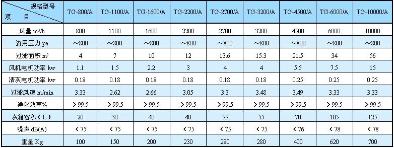 三、TG單機(jī)袋式除塵機(jī)組A型技術(shù)性能參數(shù)表: