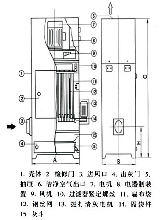 一、產(chǎn)品簡介: PL型系列單機布袋除塵器內(nèi)置連體扁布袋,除塵布袋用專用彈簧鋼絲網(wǎng)框(除塵骨架)支撐,是一種體積小,除塵效率高的_地除塵機組,pl單機布袋除塵器可以固定于車間或設備旁使用,也可以制成使用靈活的移動式單機布袋除塵器機組。 二、結(jié)構(gòu)概述: PL單機布袋除塵器基本結(jié)構(gòu)由風機、過濾器和集塵器三個部件組成,各部件都安裝在一個立式框架內(nèi)、鋼板殼體、烘漆防銹,外型美觀、結(jié)構(gòu)科學、運行可靠、使用方便。 各部件結(jié)構(gòu)特點如下: 1.風機部件采用仿國外離心通風機,風量大,風壓高,風機特性曲線硬,并采用消聲措施,使用時噪音小。 2.過濾器部件采用208工業(yè)滌綸斜紋絨布或滌綸針刺氈為濾料的扁布袋過濾器,每個布袋內(nèi)均裝有彈簧鋼絲網(wǎng),過濾效果好,更換濾袋方便,使用壽命長。 3.過濾器部件的清灰機構(gòu),是采用電動機帶動偏心輪,連桿使布袋抖動而_沾在濾袋外表面的粉塵(根據(jù)需要也可定制其它清灰方法)。其控制裝置分自控和手控兩種。自控即在風機連續(xù)工作時,清灰機構(gòu)定時自動振打清灰,手控即風機停止后清灰機構(gòu)自動工作,數(shù)十秒鐘后自動停止,也可根據(jù)需要隨時啟動清灰電機振打清灰,清灰時間長短由用戶自行調(diào)節(jié)時間繼電器?! ?.除塵布袋部件裝有即寬暢又密封的快速拆卸檢修門②,以便需要時進行檢修和移出除塵布袋。 5.除塵器部件采用抽斗式結(jié)構(gòu),_灰塵_方便。 6.除塵器上方一側(cè)的進風接口③在需要時可拆下,以便于加大進風口面積的使用。 7.該單機扁袋除塵器現(xiàn)有十六種規(guī)格,分A、B兩型。A型設灰斗抽屜、B型不設灰斗抽屜。下部加法蘭;由用戶直接配接在拆包口料倉倒料口,混料庫、噴砂箱、皮帶運輸調(diào)頭處等揚塵設備上_地除塵,粉塵直接回收。 8.本除塵器可根據(jù)設計單位或用戶實際需要,特定制造。 三、PL單機除塵器結(jié)構(gòu)簡圖: